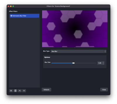 This plugin is designed to allow you to set a simple blur filter on an image or video source in OBS.